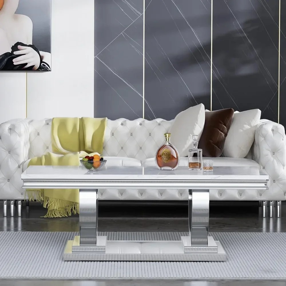 47″ Rectangular Coffee Table, Modern White Faux Marble Cocktail Table, with Silver Mirrored Finish U-Shape Stainless Steel Base