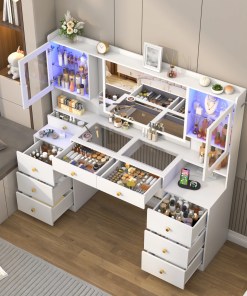 Be the first to review “61.7″ Large Vanity Desk with Mirror and Lights, Makeup Vanity with Charging Station, Sliding Drawers, 2 Cabinets with Glass Door” Cancel reply