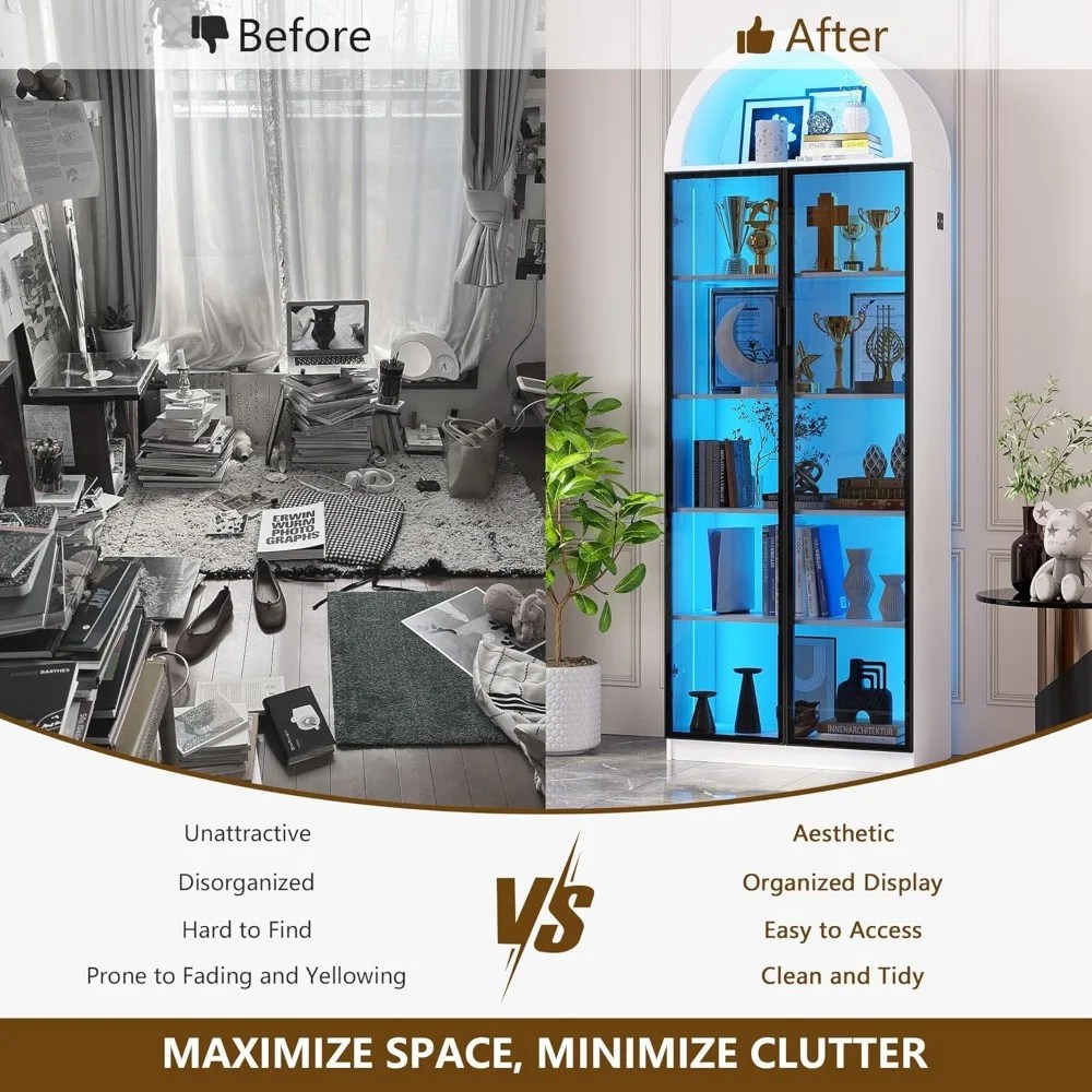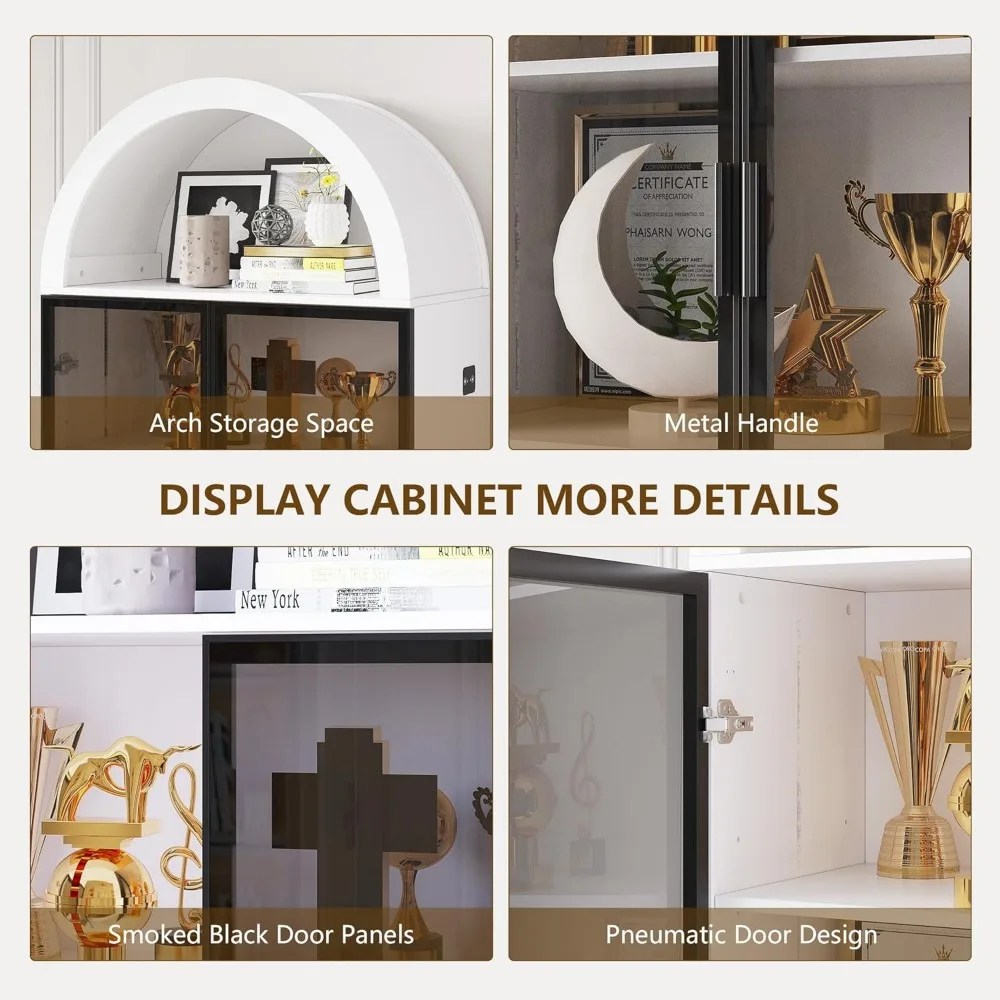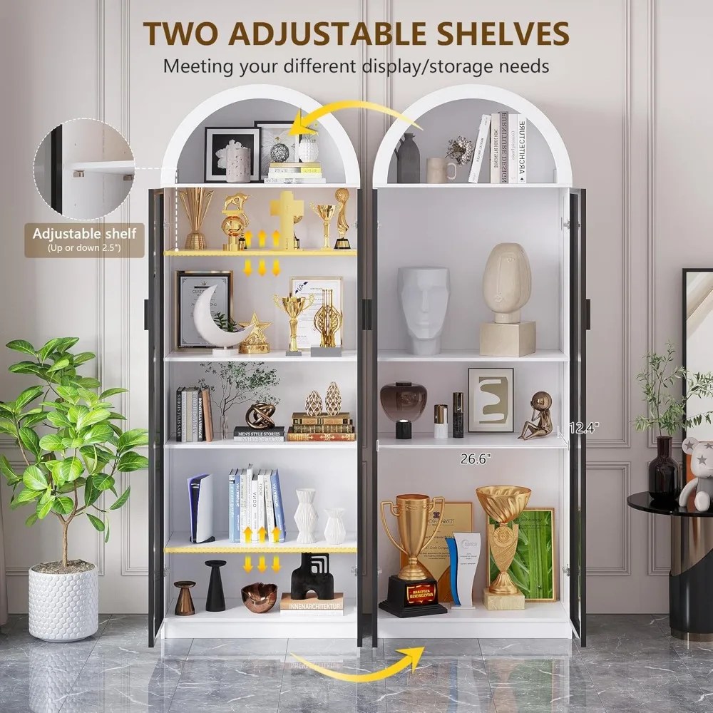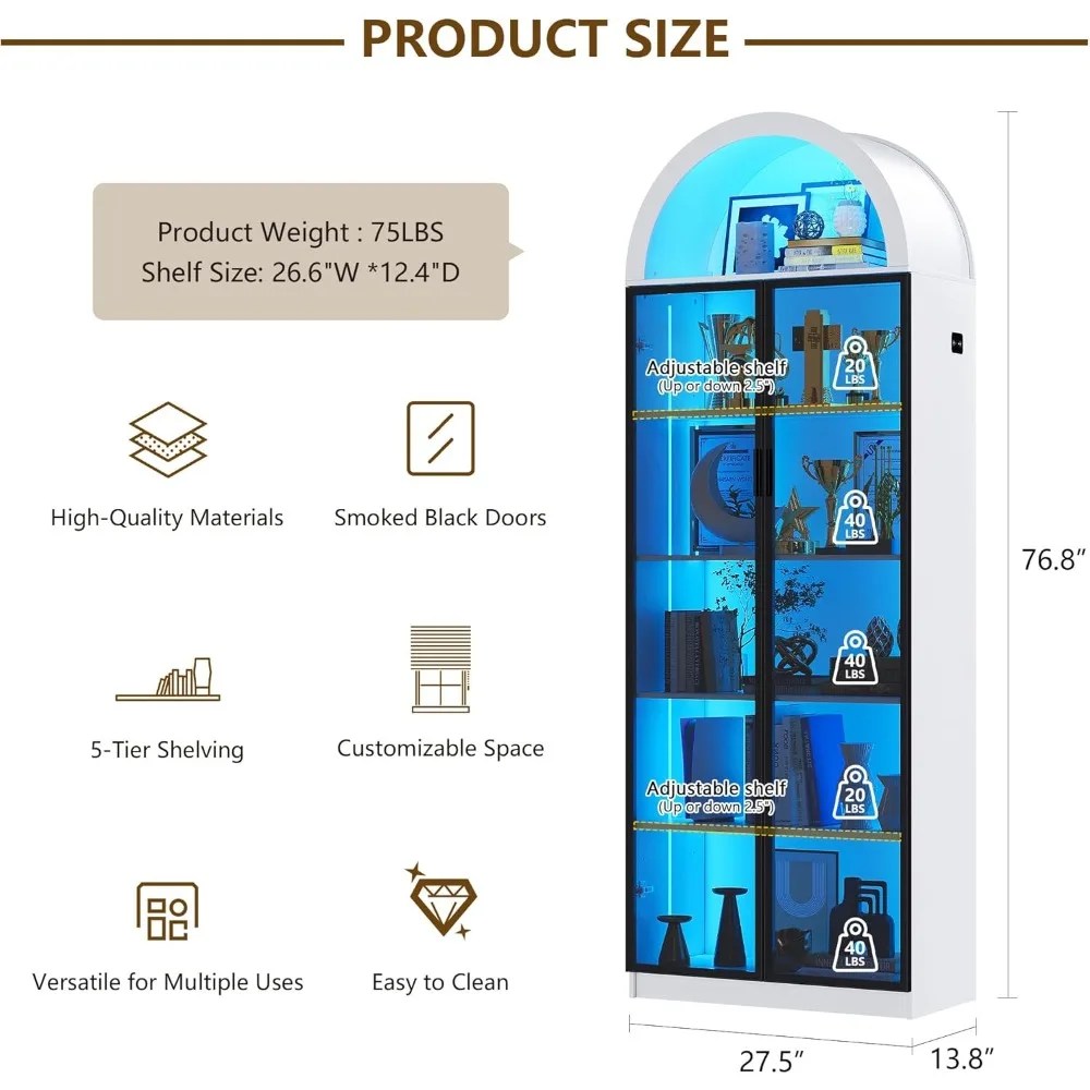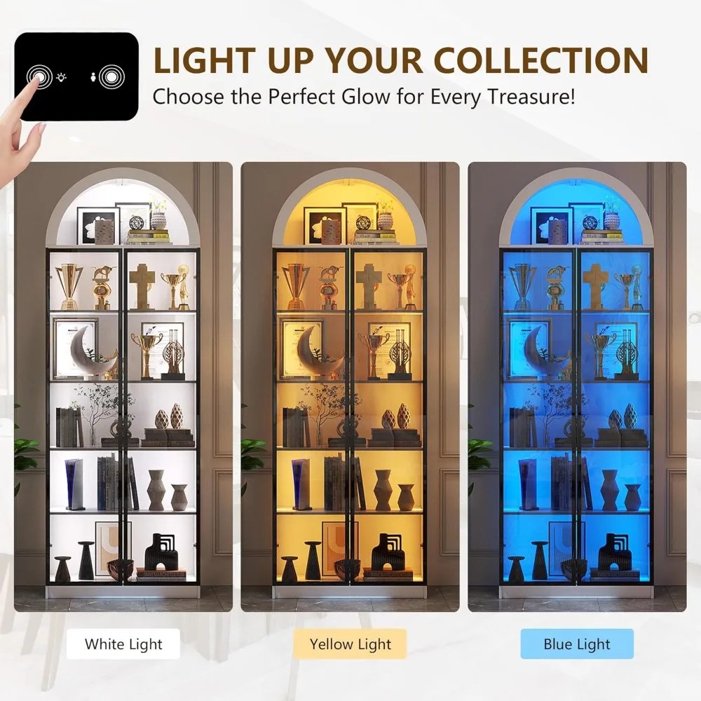 Display Cabinet with Doors and Adjustable Shelves, with LED Lights/Arch Storage Space, 76″ Tall Display Case