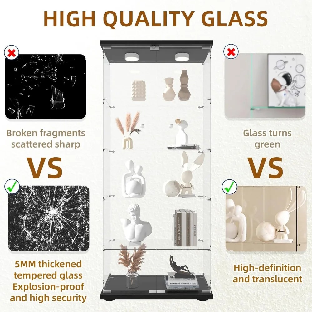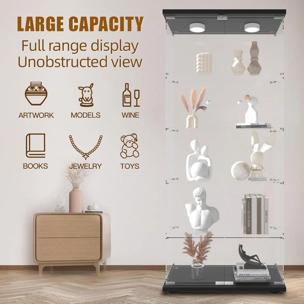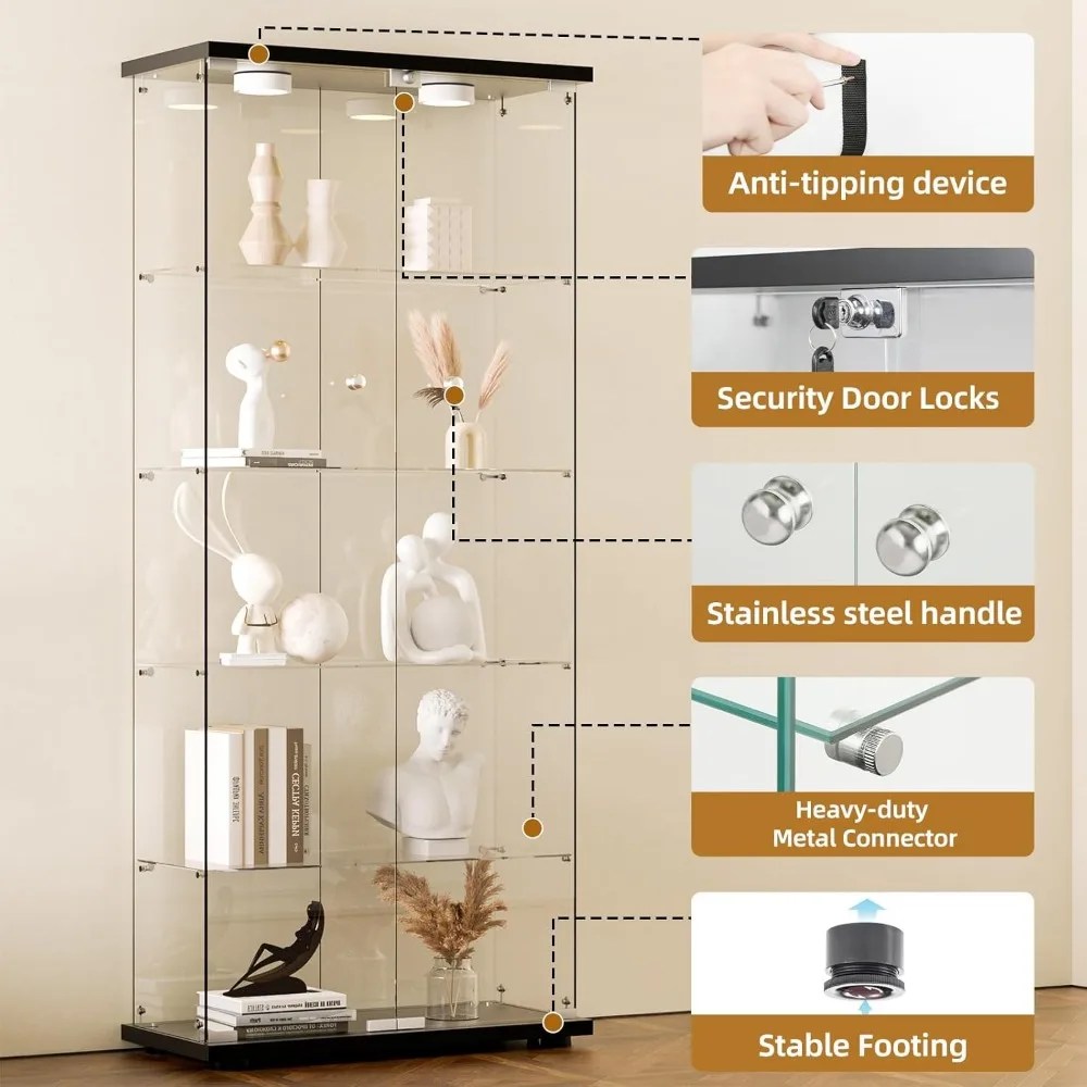 Glass Display Cabinet, Doors with Remote Control LED Push Light & Lock Standing Glass Bookshelf Showcase, Display Cabinet