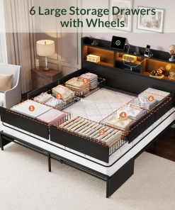 King Size Storage Bed Frame – 6 Built-In Drawers, Wooden Headboard & LED Lights with Charging Station