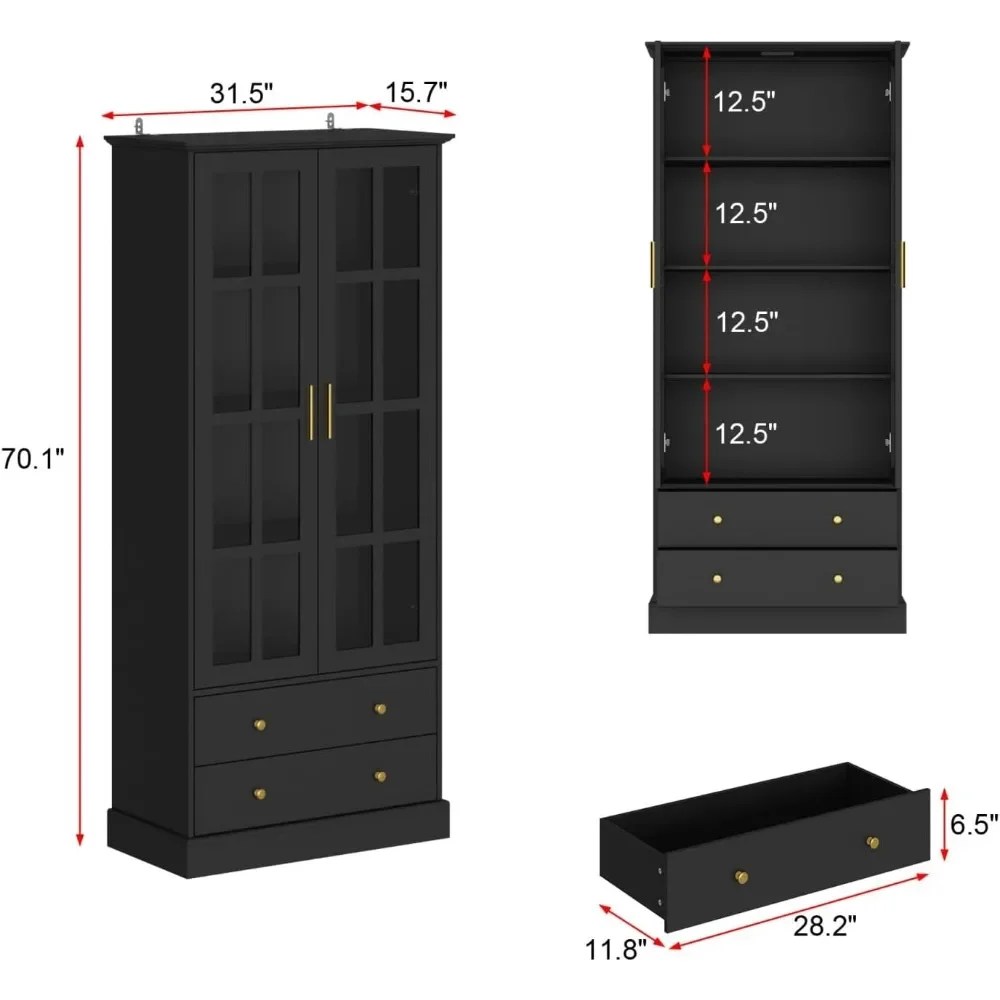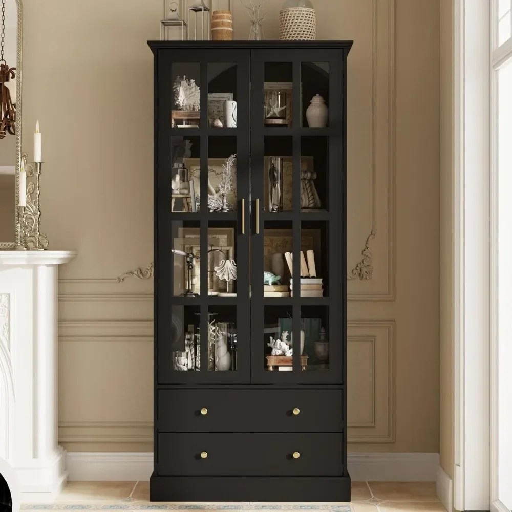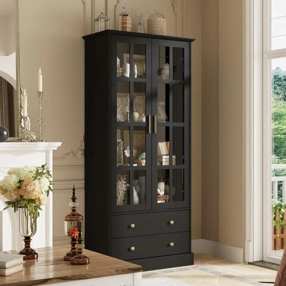 Kitchen Pantry Cabinet with 2 Glass Doors, Modern Pantry Cabinet with 4-Tier Shelves,Storage Cabinet with 2 Drawers for Kitchen