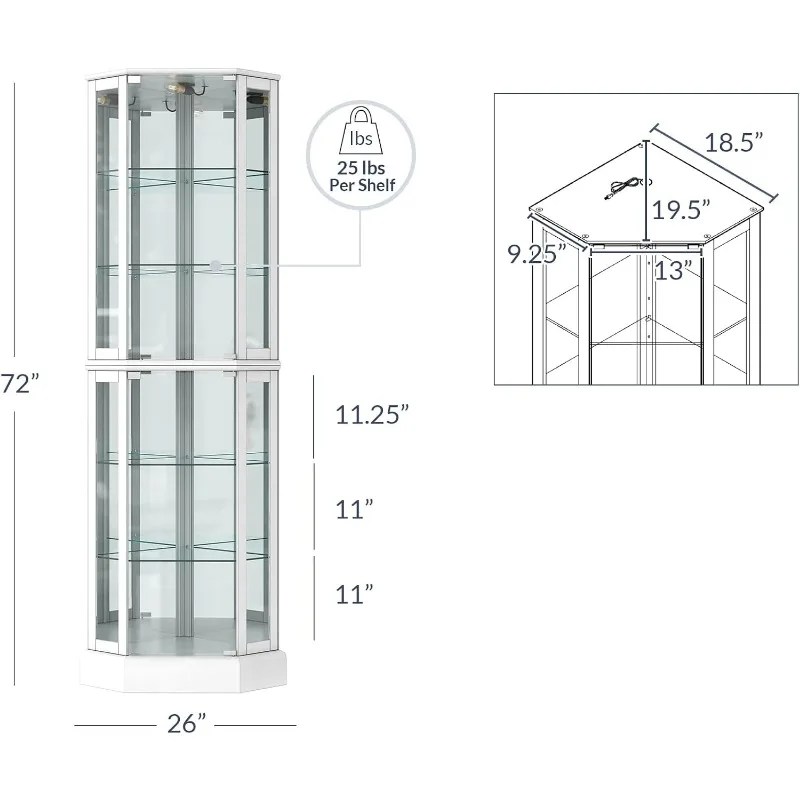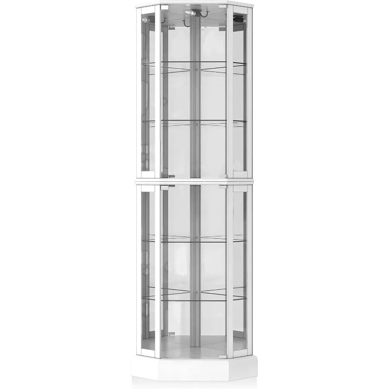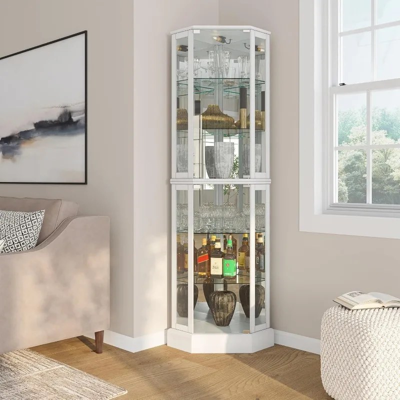 Lighted 3-Side Glass Display Curio Cabinet with Tempered Glass Doors and Shelves, Corner Storage Rack – White