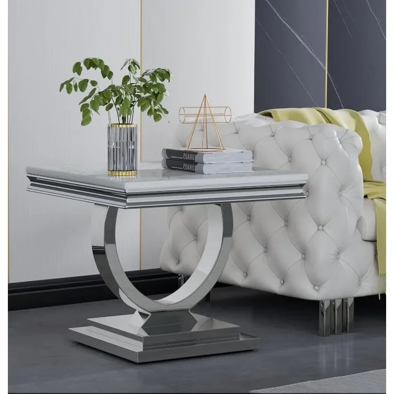 Marble End Table with Stainless Steel Base, 22.8″ Square Nightstand with Faux Marble Top, Luxury White and Silver Side Table
