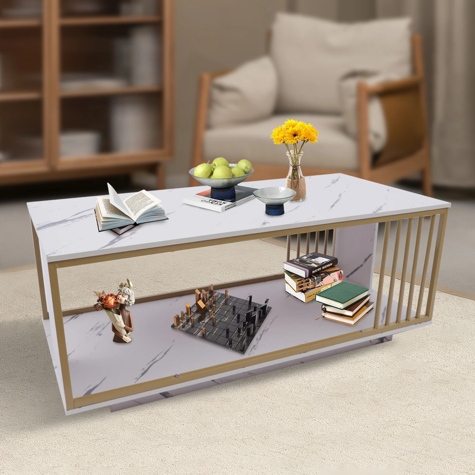 Modern White Faux Marble Coffee Table 2 Tier Center TV Table Cocktail Table Sofa End Table with Gold Frame for Living Room