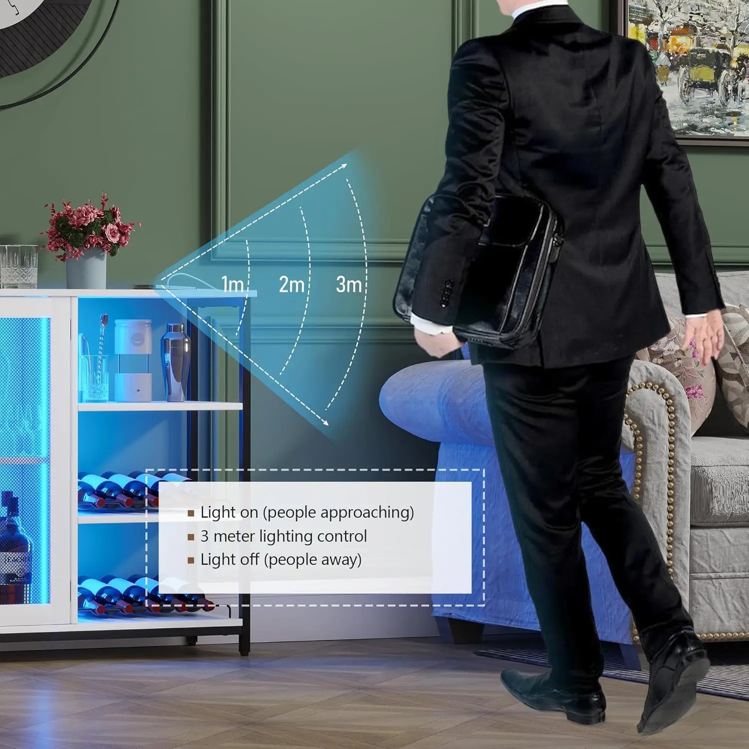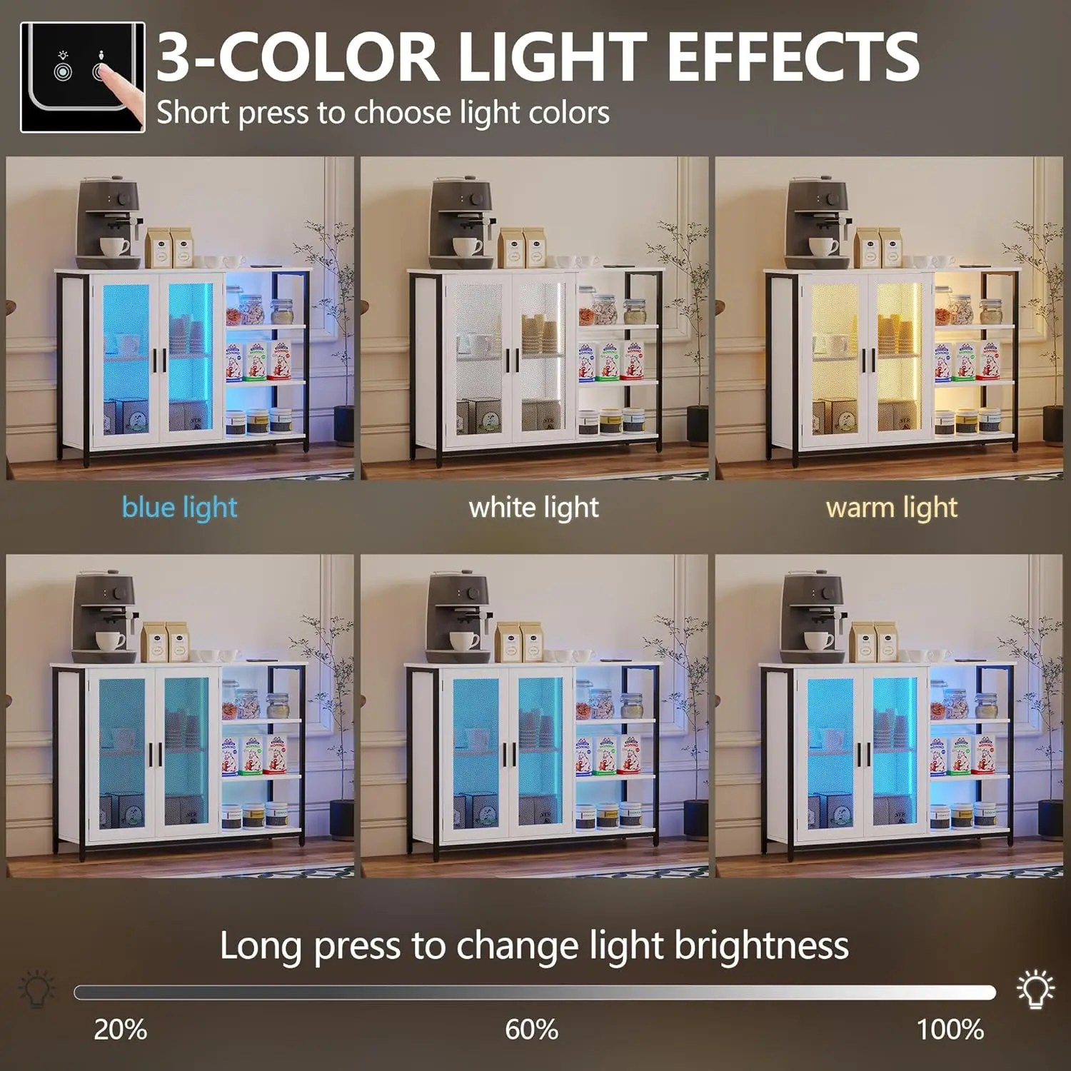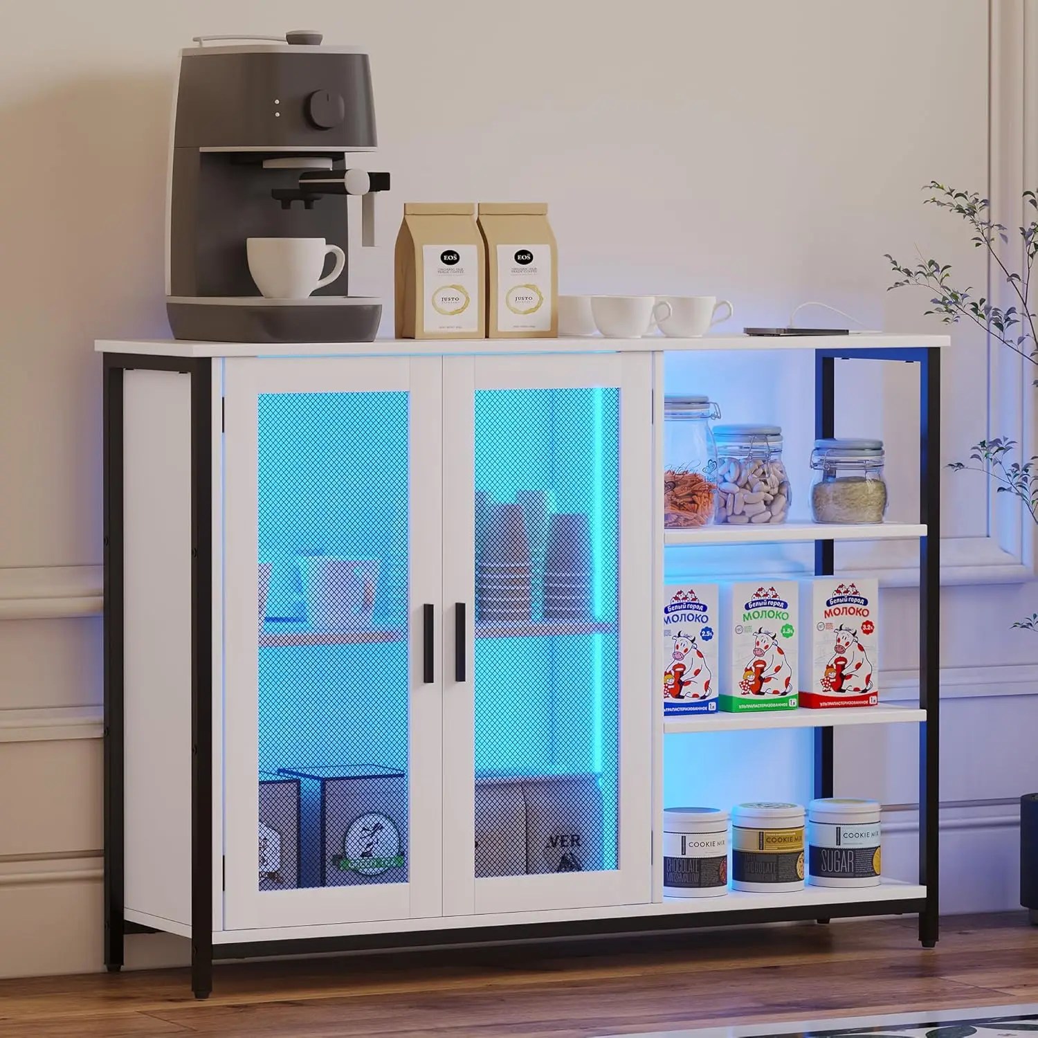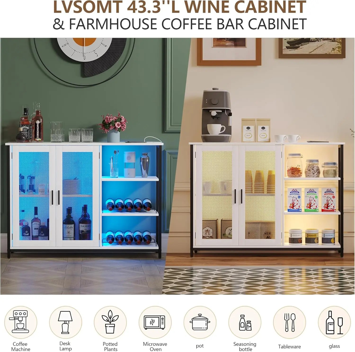 NEW LED Farmhouse Coffee Bar Cabinet, Wine Cabinets with Removable Wine Rack, Buffet Cabinet with Motion Sensor