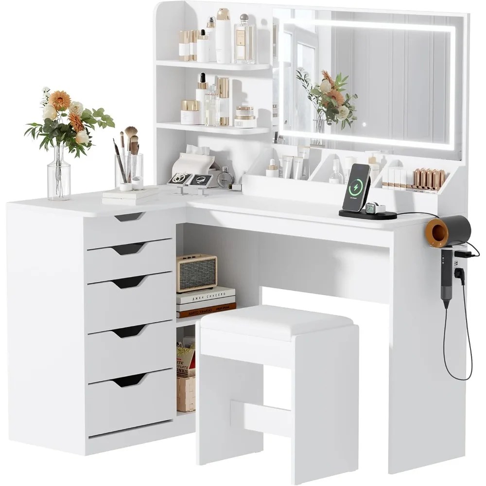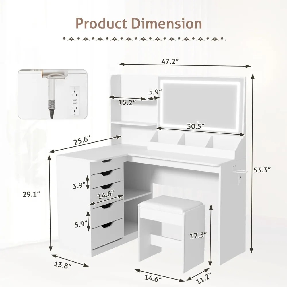 Vanity Desk with Lights and Mirror, L Shaped Makeup Table with Stool, Dresser with Hairdryer Holder and Power Outlet