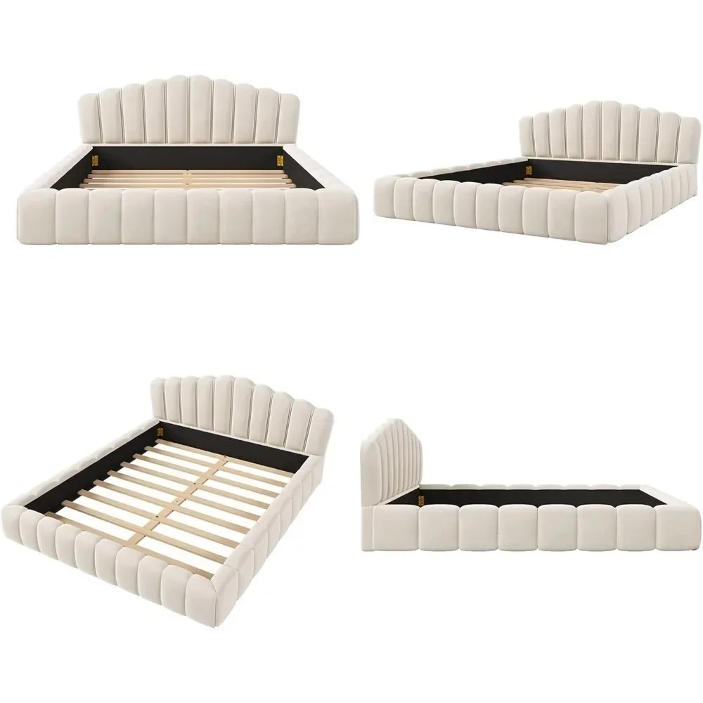 Velvet Upholstered Queen Bed Frame,Floor Bed Shell-Shaped Headboard for Bedroom,weight capacity 500lbs.Bed Frames