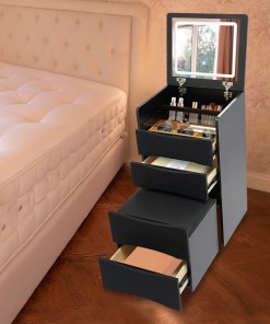 Be the first to review “Wooden Dresser With LED Lamp With Adjustable Brightness Folding Cosmetic Table With Stool Storage Cabinet With 3 Drawers” Cancel reply